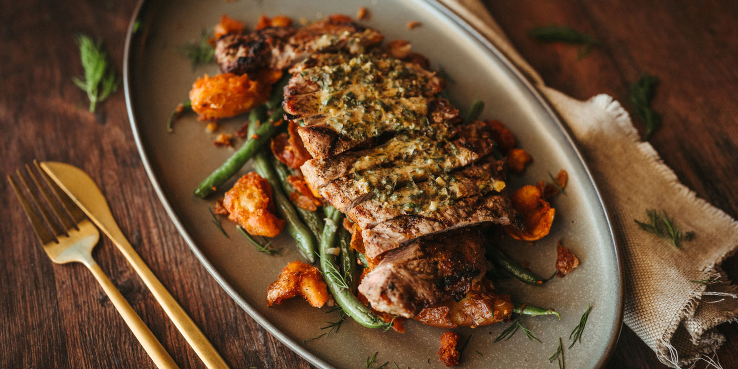 10oz AAA striploin, smashed mini potatoes, shallot green beans, cowboy butter.